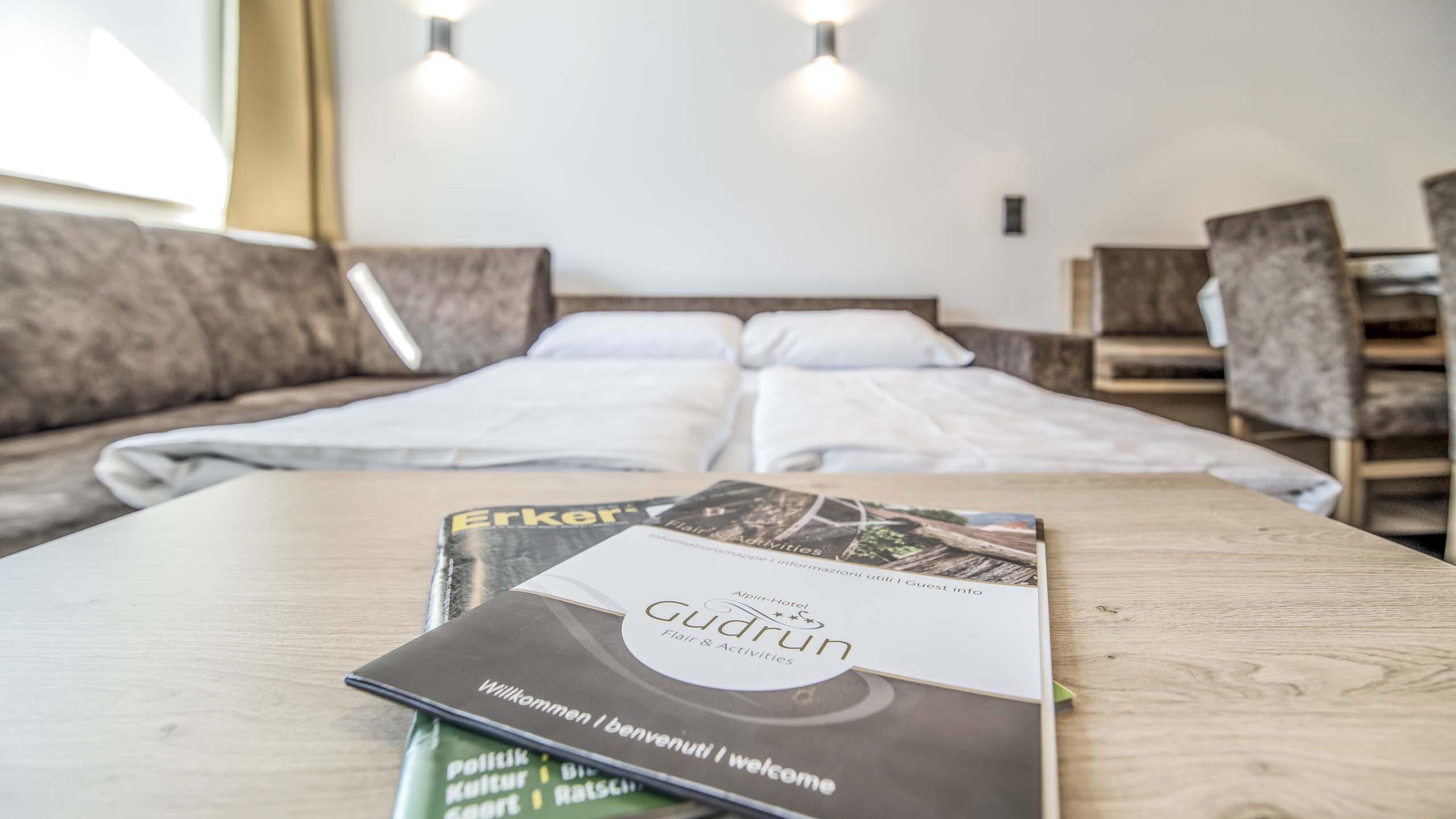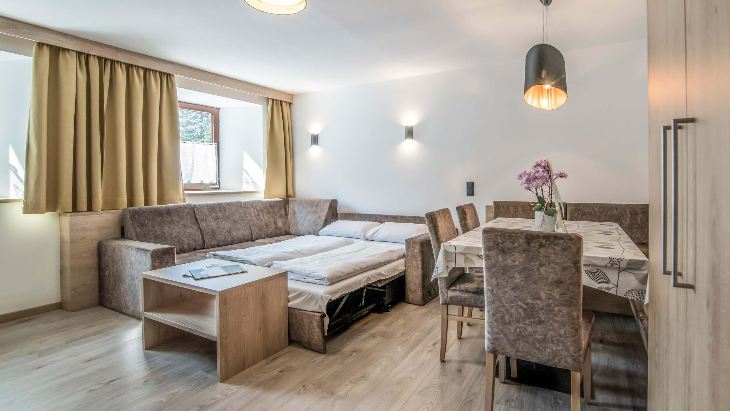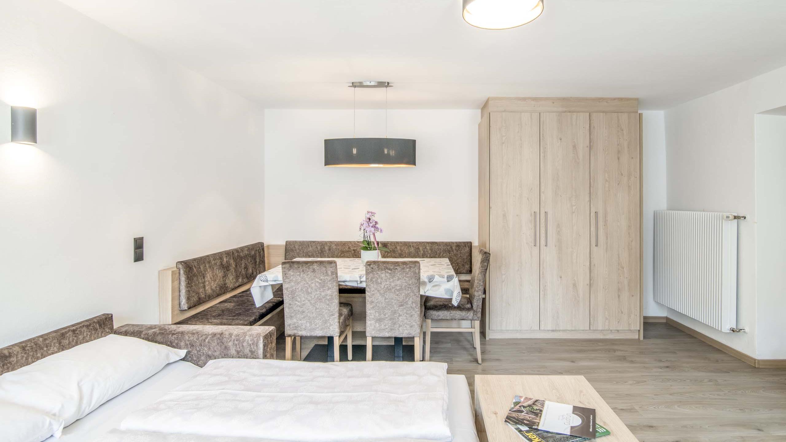 Soggiorno: tavolo, sedie, stube in legno, 2 letti singoli, armadio, 2 finestre, cassaforte