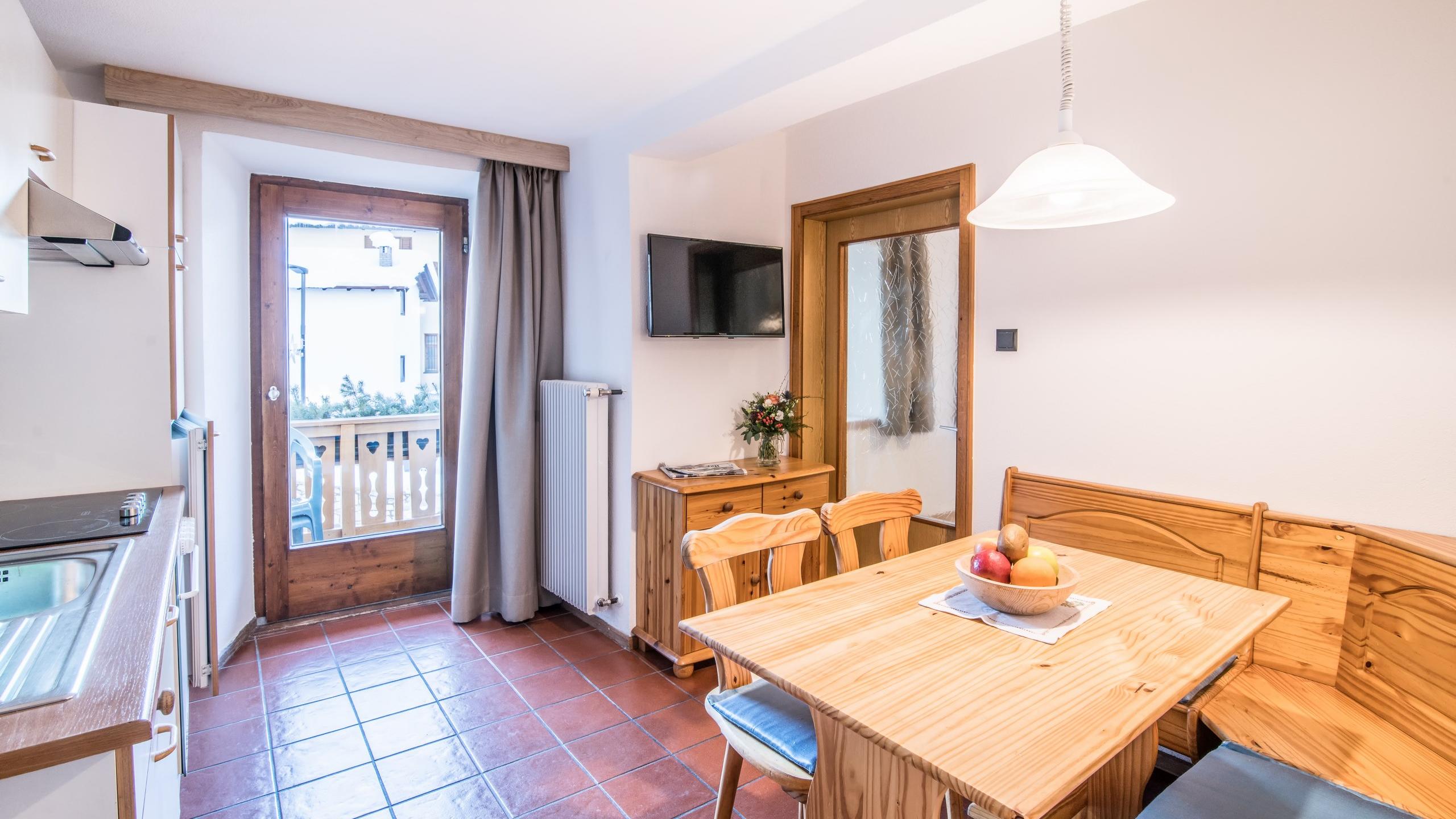 Soggiorno con Cucina: tavolo, sedie, stube in legno, 1 balcone, cassaforte
