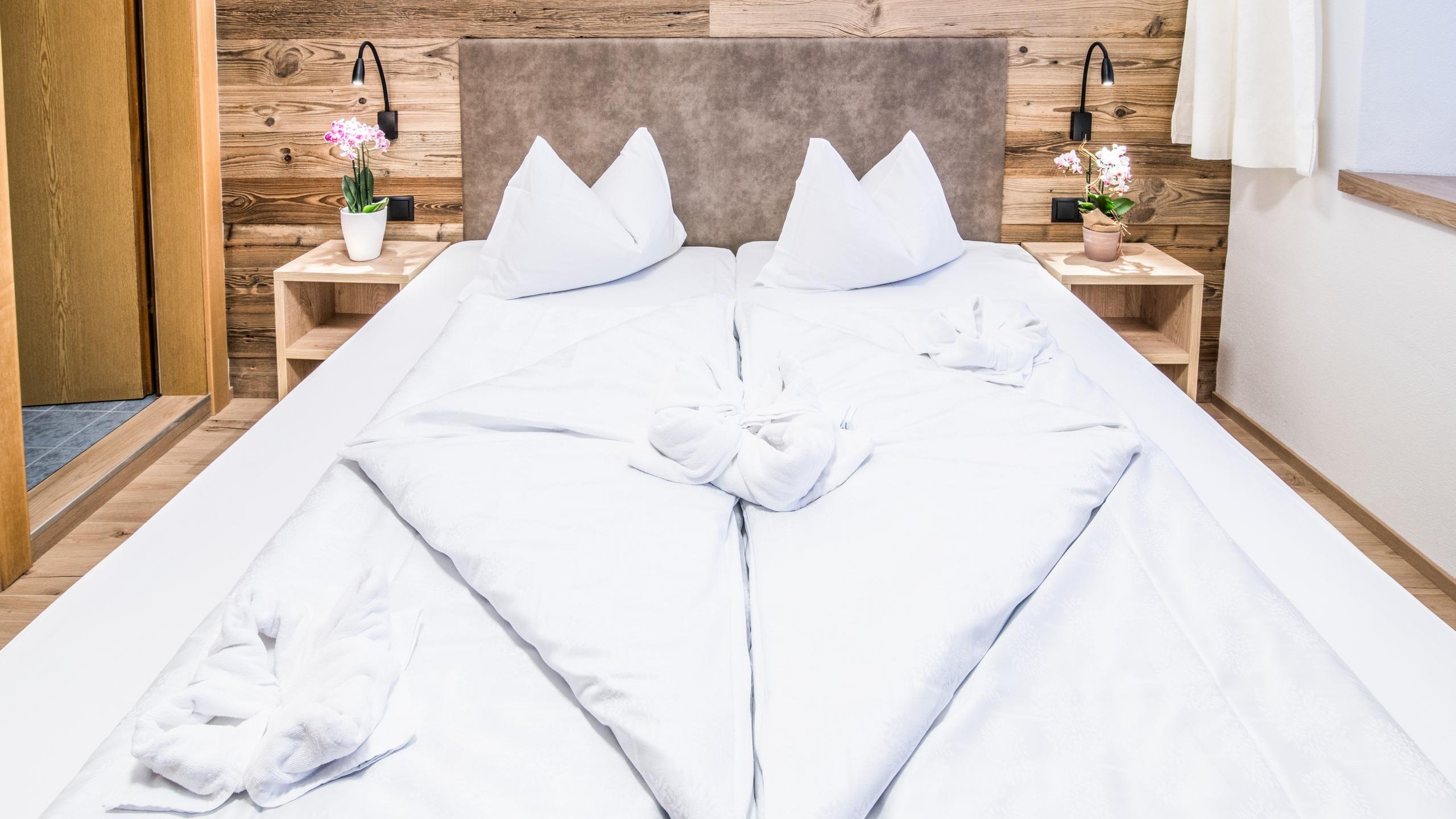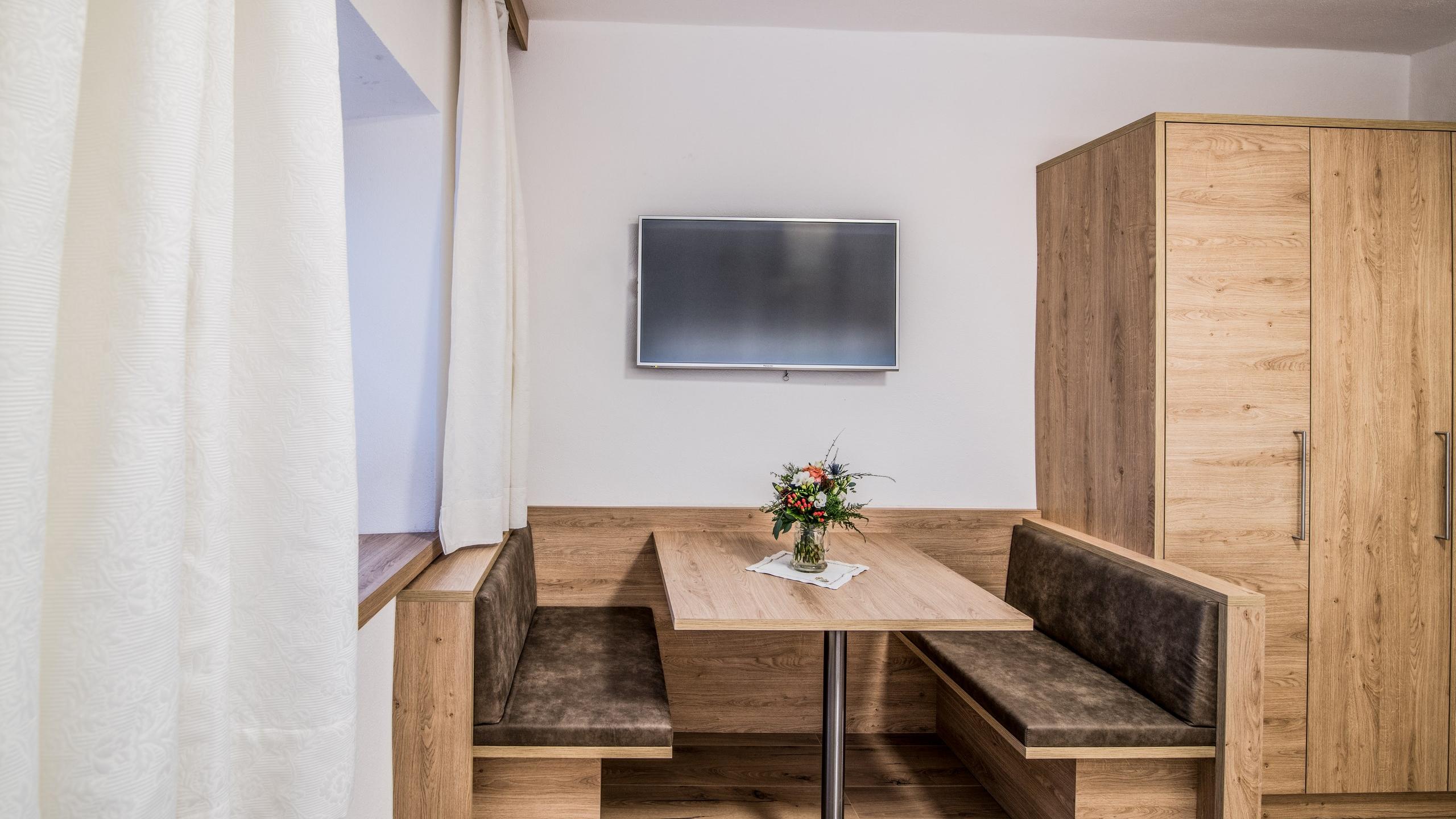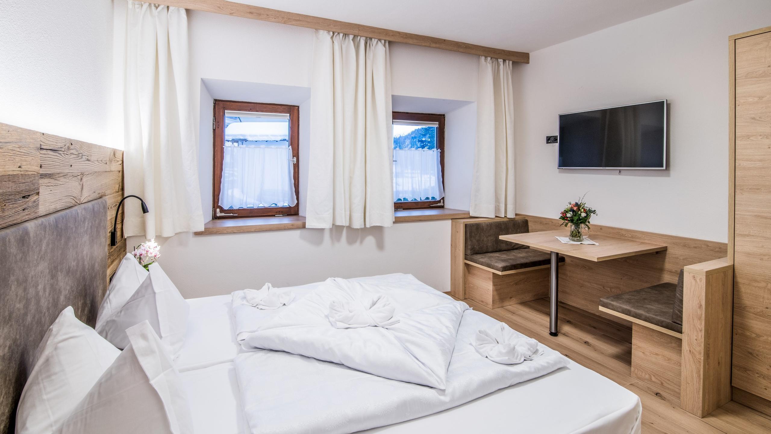 Wohn-Schlafzimmer: Tisch, Stühle, Doppelbett, Schrank, 2 Fenster, Notbett und Kinderbett auf Anfrage, Safe