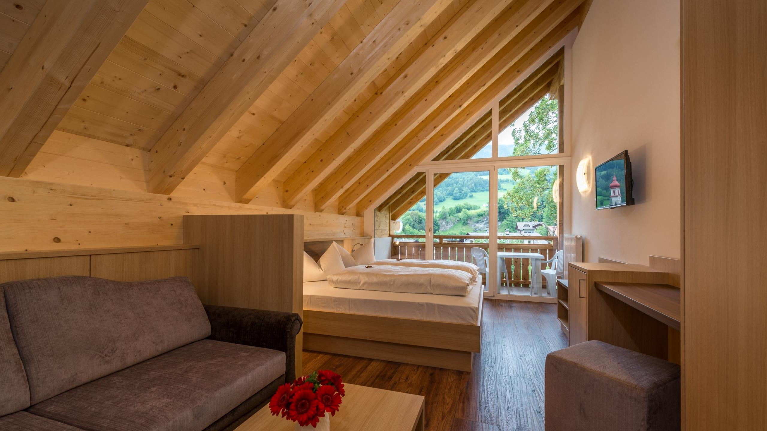 Die heimischen Hölzer in der Juniorsuite Woody sorgen für ein gesundes Raumklima und erholsamen Schlaf. Die renovierte Suite mit herrlichem Panoramablick ist mit einem großen, gemütlichen Lattoflex-Doppelbett ausgestattet, einem Schlafsofa, einem Bad mit ebenerdiger Dusche, WC, Kosmetikspiegel, Duschutensilien und Föhn sowie mit SAT‑TV, Safe, Telefon und natürlich mit kostenlosem WLAN. Auf dem Balkon genießt ihr den traumhaften Blick auf die Berge. Spot on Wanderlust!